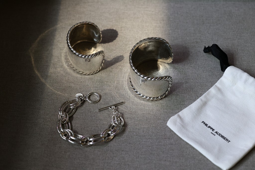 雖然PHILIPPE AUDIBERT材質多是黃銅非純銀,但沉甸甸的質感我很喜歡,唯一小缺點是因為太厚實,粗手環夏天帶很容易滲汗XD