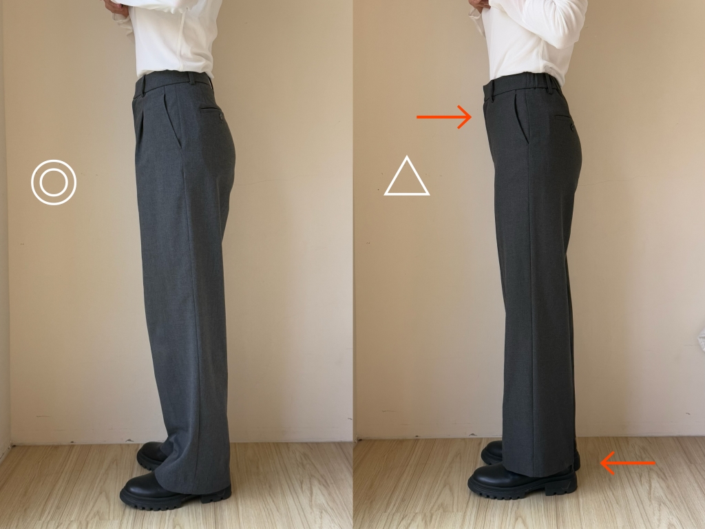 想要呈現鬆弛感,適度的寬鬆感跟垂墜度是必須。過度貼合身體曲線、太短或太繃都是NG的,新購入的寬褲不光是正面看不行,側面、背面也都差強人意。這幾年流行打摺寬褲,不放比照圖還不知道,從側面看打褶修飾小腹的效果很厲害啊!