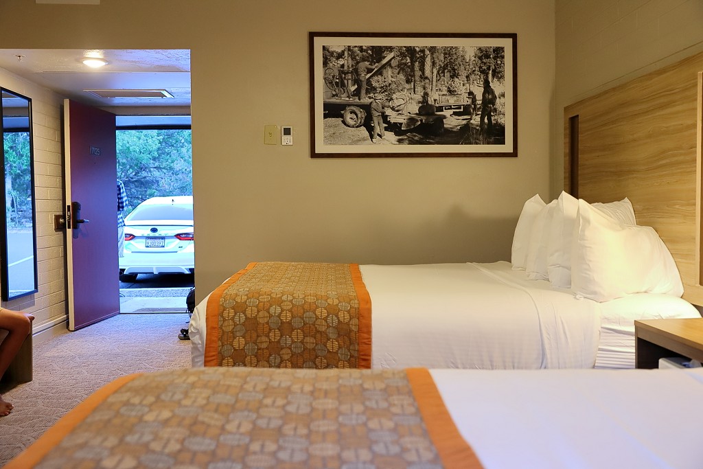 以國家公園住宿的標準來看,Yavapai Lodge算是很不錯了。在鄰近的餐廳棟check in後車輛可直接開到房門口卸貨,空間大小適中一家四口住起來頗舒適,入門就有簡易的衣櫥方便卸下戶外健行的背包,房內又有大大的冰箱可存放飲品跟早餐。最讓人驚喜的是,居然還有台膠囊咖啡機!即使不喝咖啡,咖啡機也能充當電熱壺燒熱水(煮泡麵)使用,在郊外是很實用的設備。