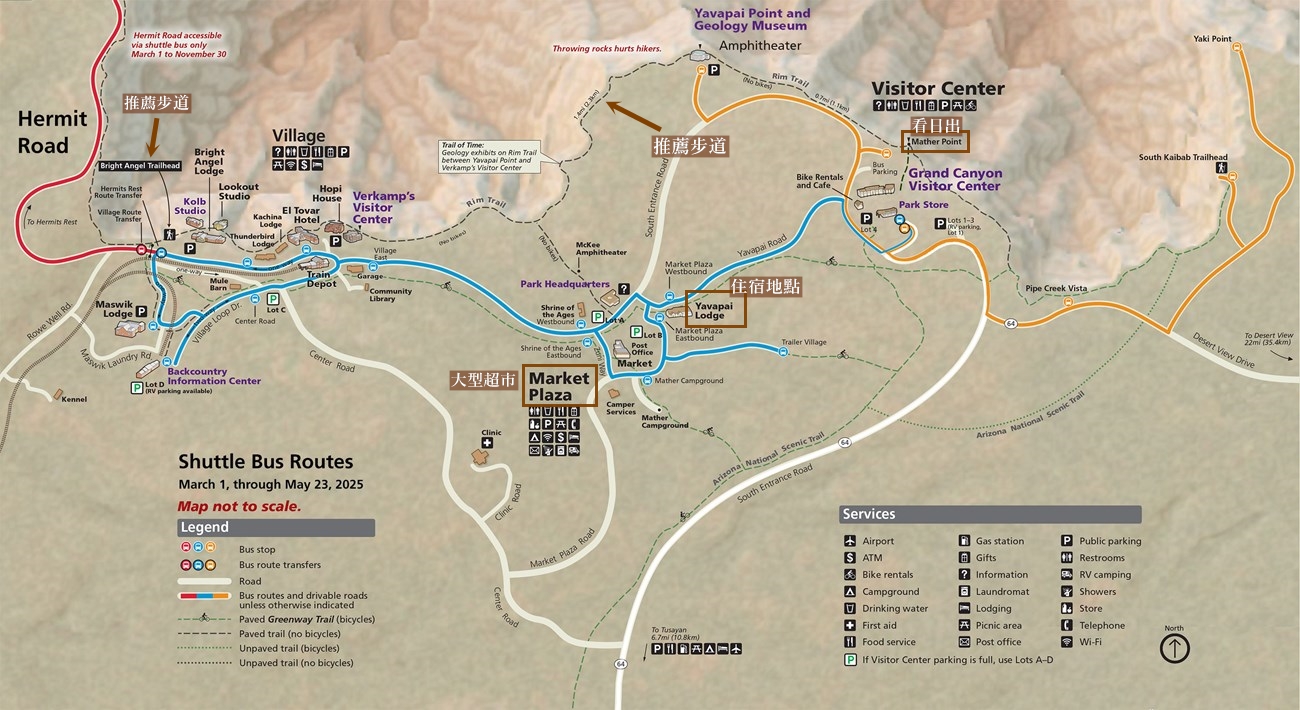 - 行經:Market Plaza、El Tovar 飯店、Bright Angel Lodge、Backcountry Office 等