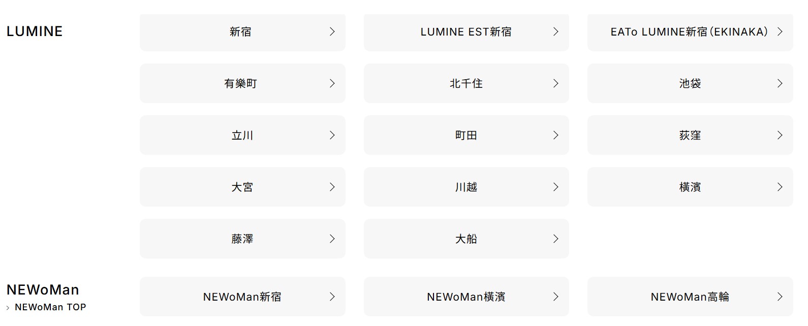 毫無懸念,去有LUMINE跟NEWoMan的地方就對了!(除了LUMINE EST太少女)雖然有樂町跟北千住分店規模不比新宿,但品牌集中倒是意外好逛。不主打麼精品而是專為 30以上歲女性設計的時尚百貨,風格偏現代都市、簡約質感佳,是我到關東旅行時必逛的百貨。想看特定LUMINE有哪些品牌,可至官網確認。